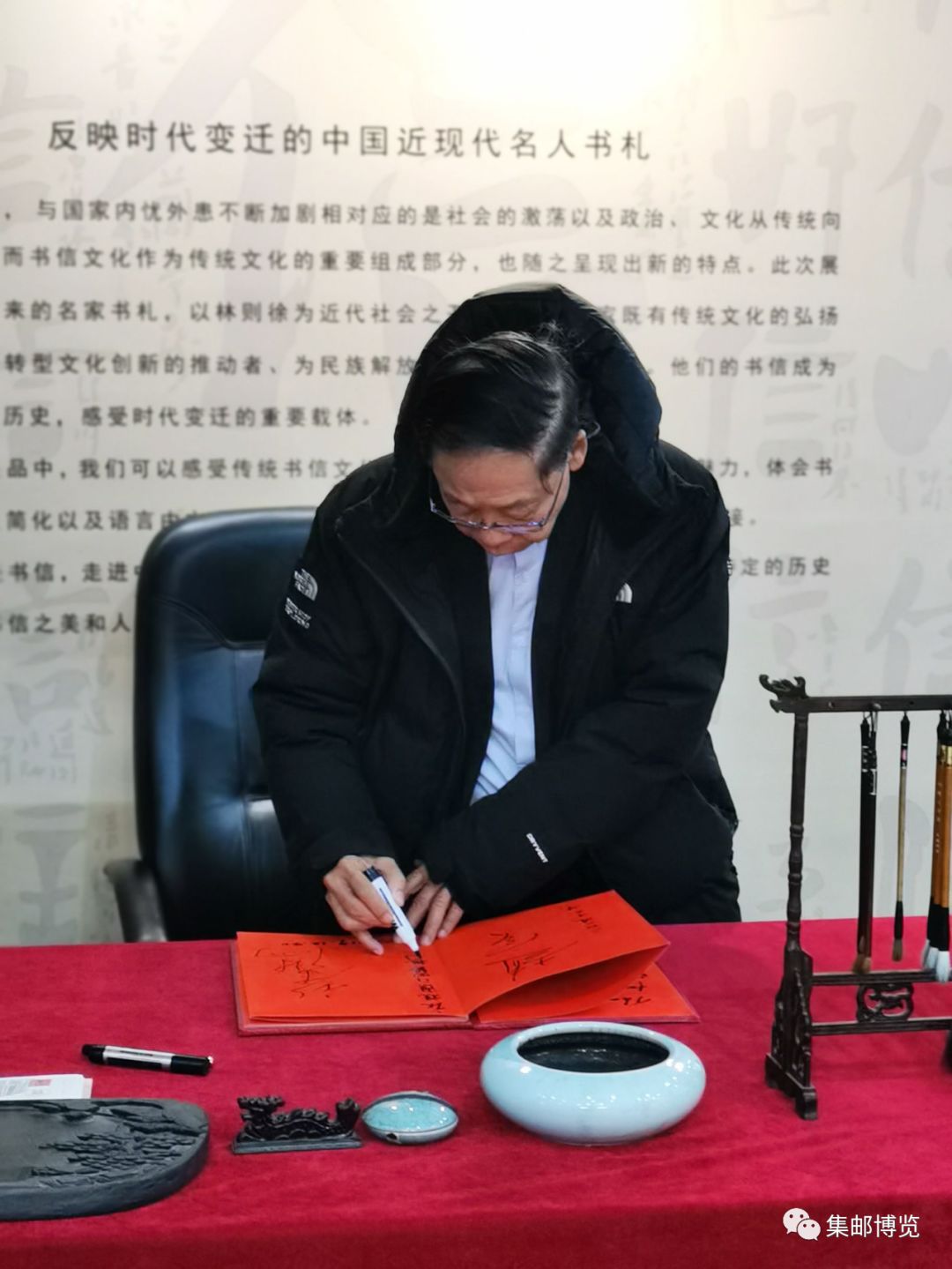 黎先生既是澳门美协负责人,又是澳门知名美术家,曾多次参与澳门邮票设计,其画作曾4次登上邮票。黎先生在观展中动情地说,"在北京看到澳门邮票展,感到十分亲切。这个日子很有纪念意义!" 澳门艺术家“反客为主”,详细讲述了多套澳门邮票背后的故事,充满了对中华文化的一片深情。在看到自己的作品在展览中展出后,黎先生十分开心,在参观结束后欣然题字“庆祝澳门回归祖国二十周年”。