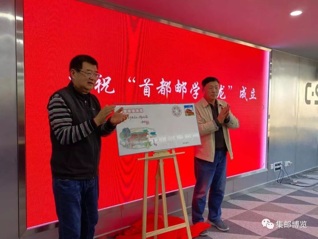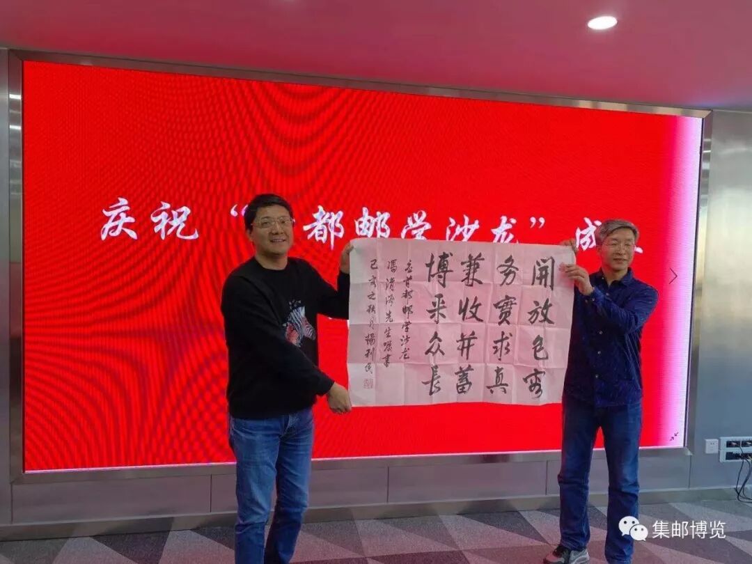 首都邮学沙龙召集人李国庆、冯清海展示全国集邮联会长杨利民题写的“开放包容,务实求真,兼收并蓄,博采众长”的沙龙宗旨