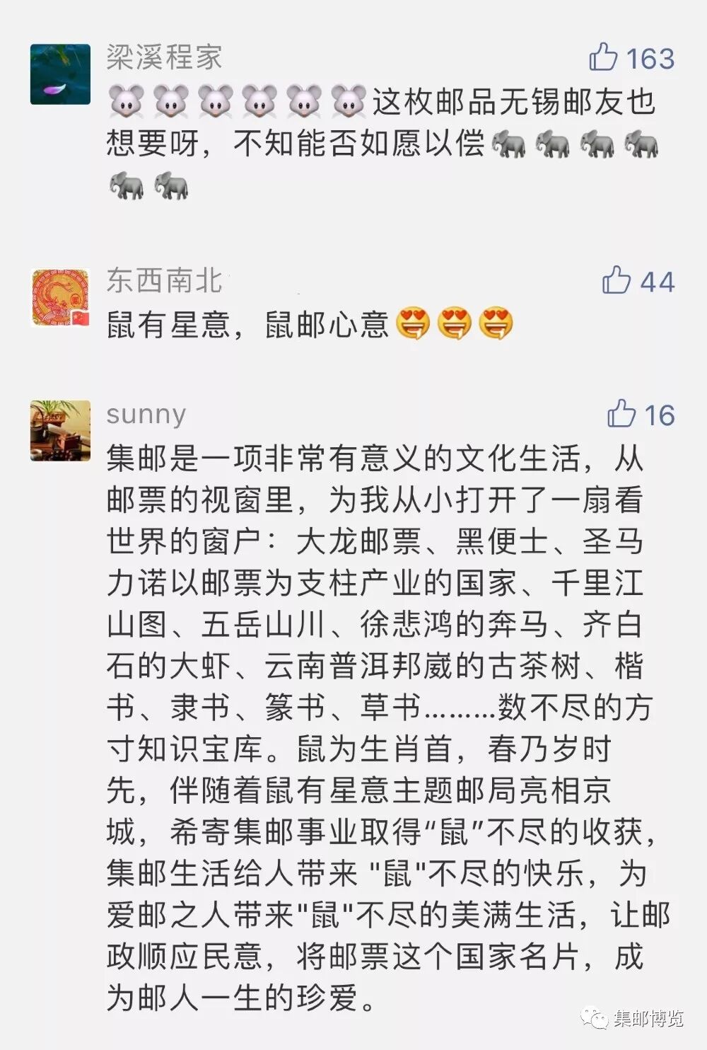 这一周 ,小编给您报道了两个活动消息:一个是预告“北京推出年画版‘鼠咬天开’邮资机宣传戳”,另一个是“鼠有星意主题邮局亮相京城,郭峰荣任集邮文化宣传大使”。配合报道,小编也给大家准备了两个福利,其中第一个福利已经在现场实寄出去了,另一个今天要来开奖啦~ 开奖之前,小编先在此谢谢大家的积极参与,踊跃留言。同时对没入选的邮友道声抱歉,因为微信平台对留言数量有限制,只能忍痛割爱了,还望大家理解~ 下面,到了开奖时刻,快来找找有没有您的名字!
