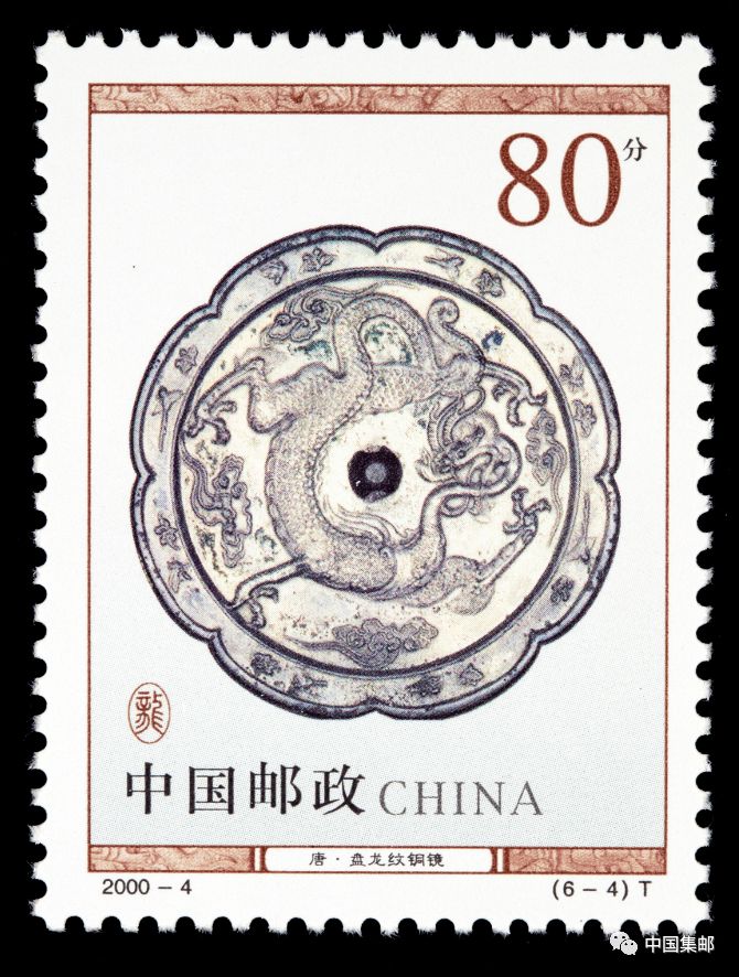 龙,在我国有着极其特殊的含义,是中华民族的象征,因此人们对龙有着特别的情怀。中国邮政于2000年3月7日发行《龙(文物)》特种邮票,一套6枚,其中一枚便是唐·盘龙纹铜镜。