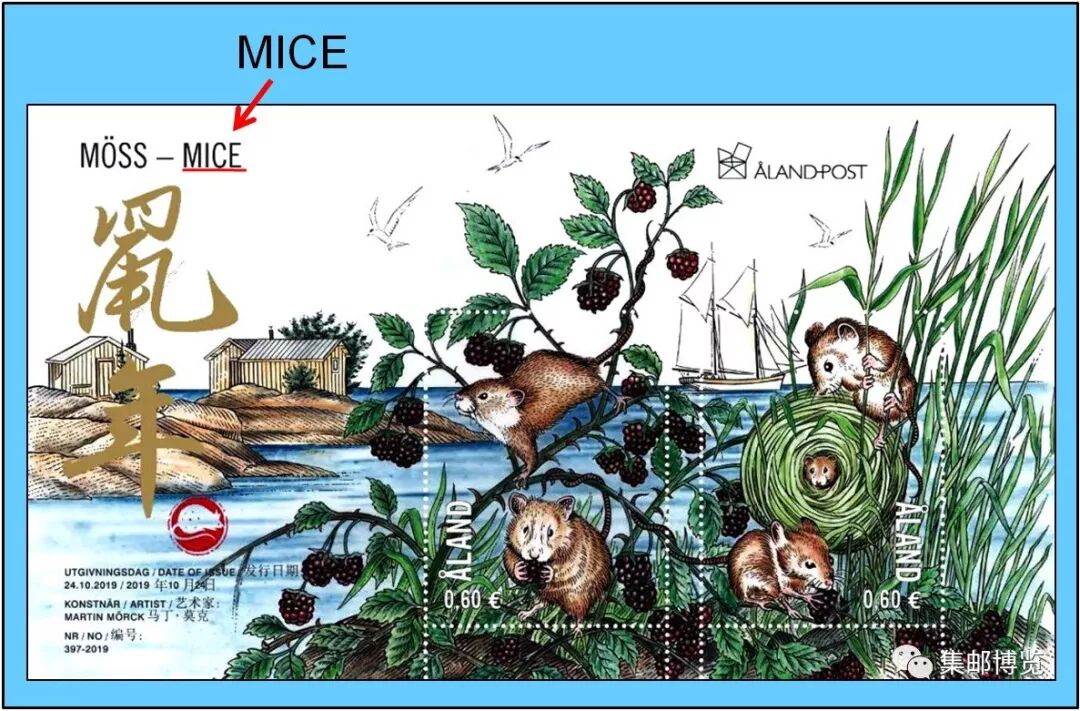 于2019年10月24日发行《鼠年》邮票一套2枚,另发行小全张。小全张左边纸上印有醒目的金粉色汉字行书“鼠年”和黑色瑞典文加英文的“MÖSS-MICE”(均为“老鼠”)。在这里,“鼠”的英文没写成“RAT”,而是用了“MOUSE”的复数单词“MICE”——