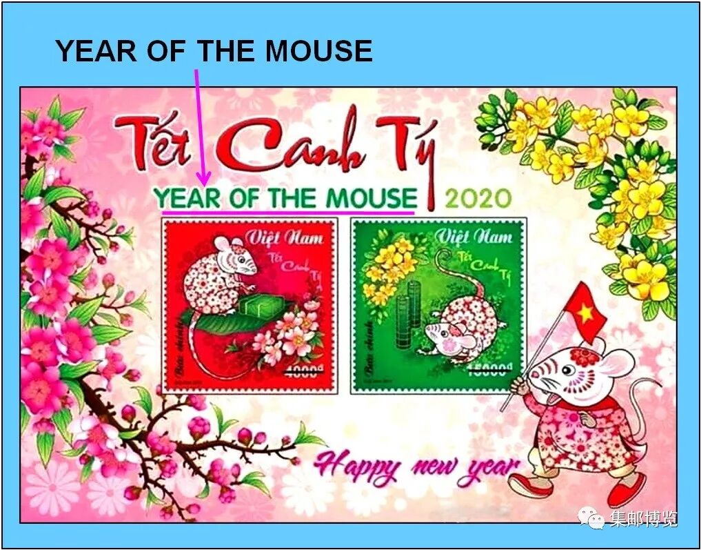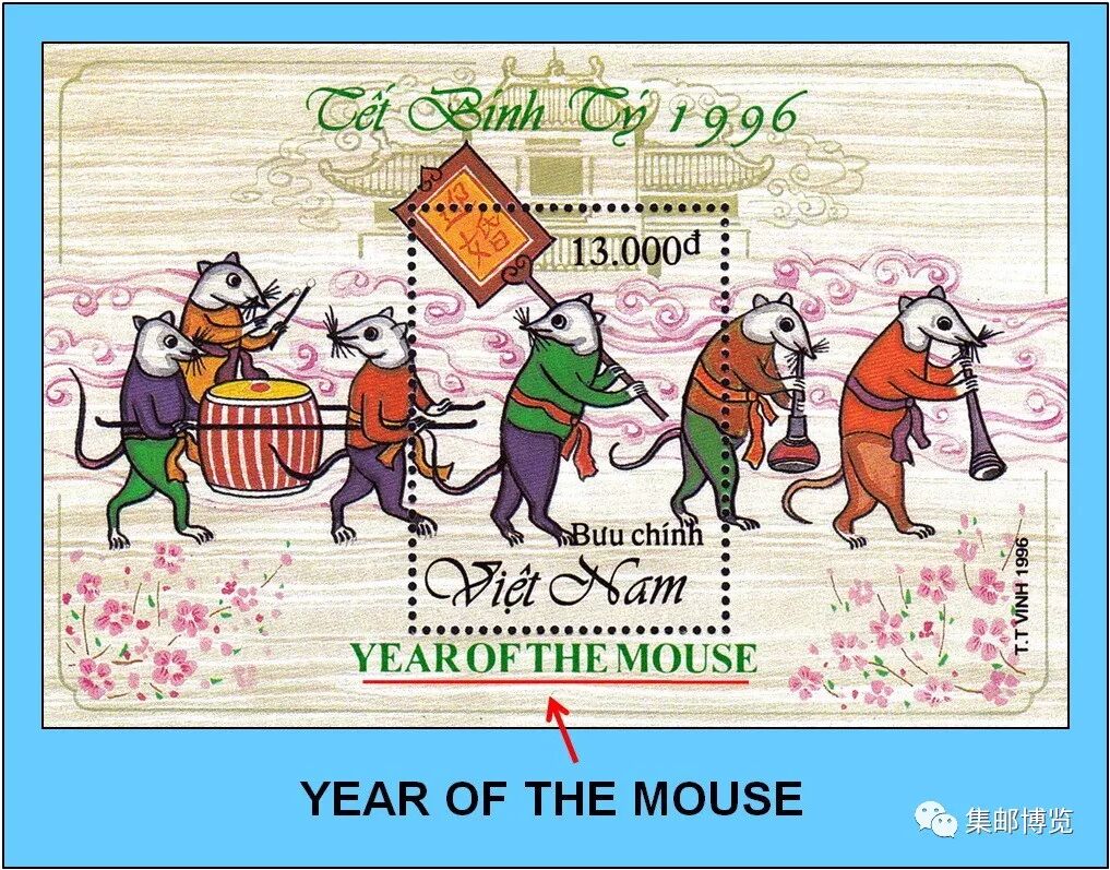 越南“鼠年”邮票上用“MOUSE”表示“鼠”,并非从现在才开始。如1996年1月2日发行的“鼠年”邮票小型张,下边纸上印的也是“YEAR OF THE MOUSE”——