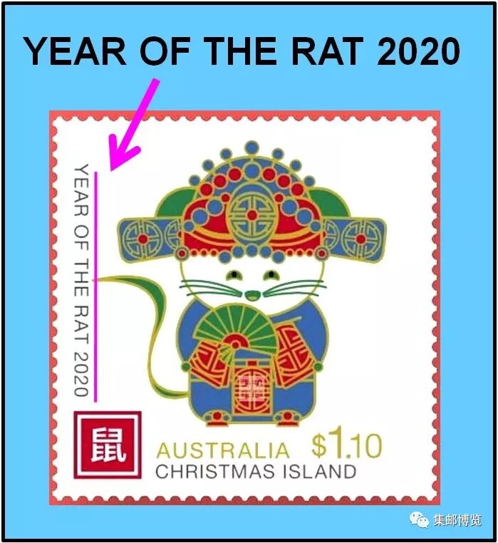 将于2020年1月17日发行《鼠年》邮票一套2枚(附图为其中的国内基本邮资永久邮票),另发行小型张。在邮票中的汉字篆书“鼠”字下,同时印有英文“RAT”——