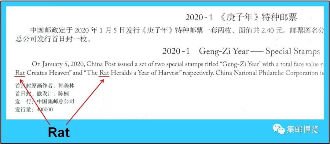 说到这里,笔者觉得我们中国人首先自己要重视起来,在发布、发行的相关宣传中,对鼠年的“鼠”的英文一律应写成“mouse”,而不宜用“rat”。比如,中国集邮总公司《庚子年》邮票首日封背面的英文说明中,将“鼠”的英文写成“Rat”是不妥的,应改为“Mouse”——