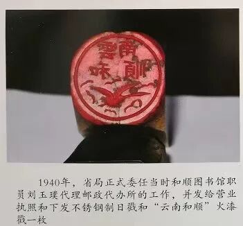 1940年云南省邮政局委任当时和顺图书馆职员刘玉璞代理“邮政代办所”的工作,颁发营业执照和“云南·和顺”火漆邮戳一枚,由省邮局和县邮局双重领导。