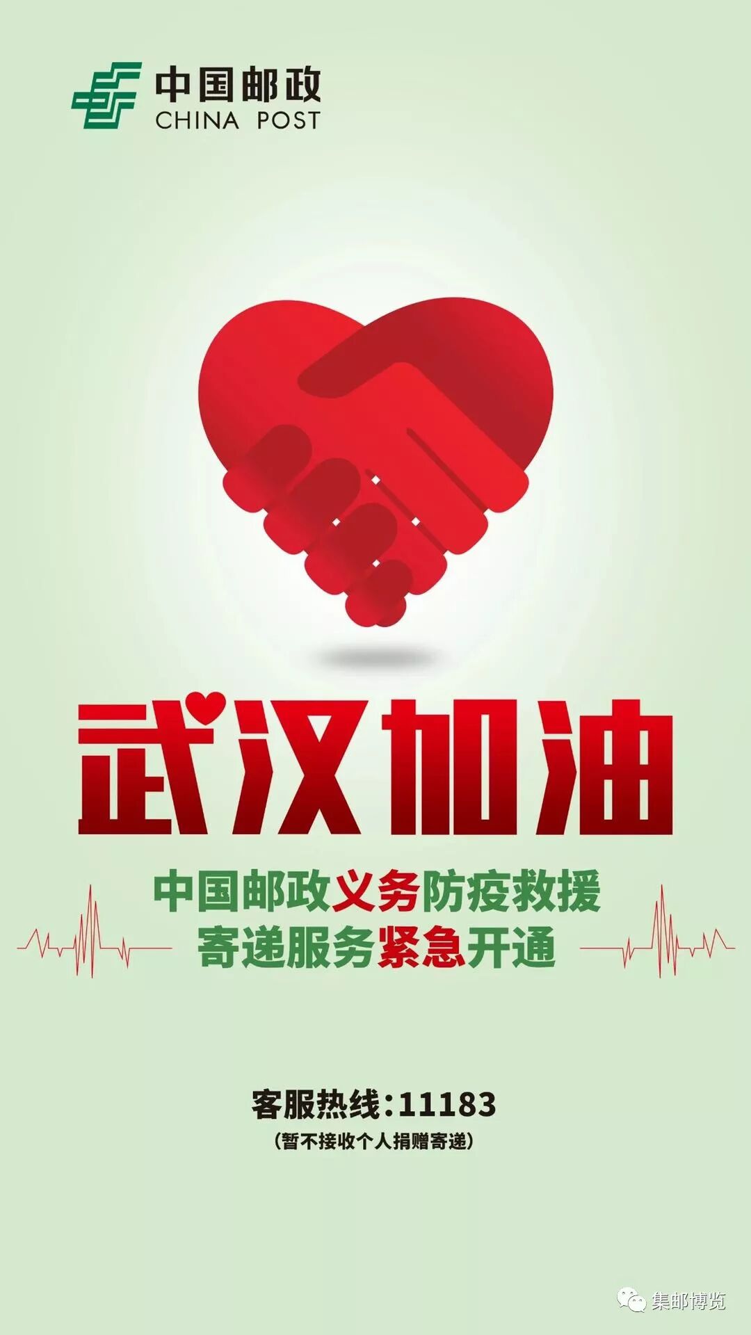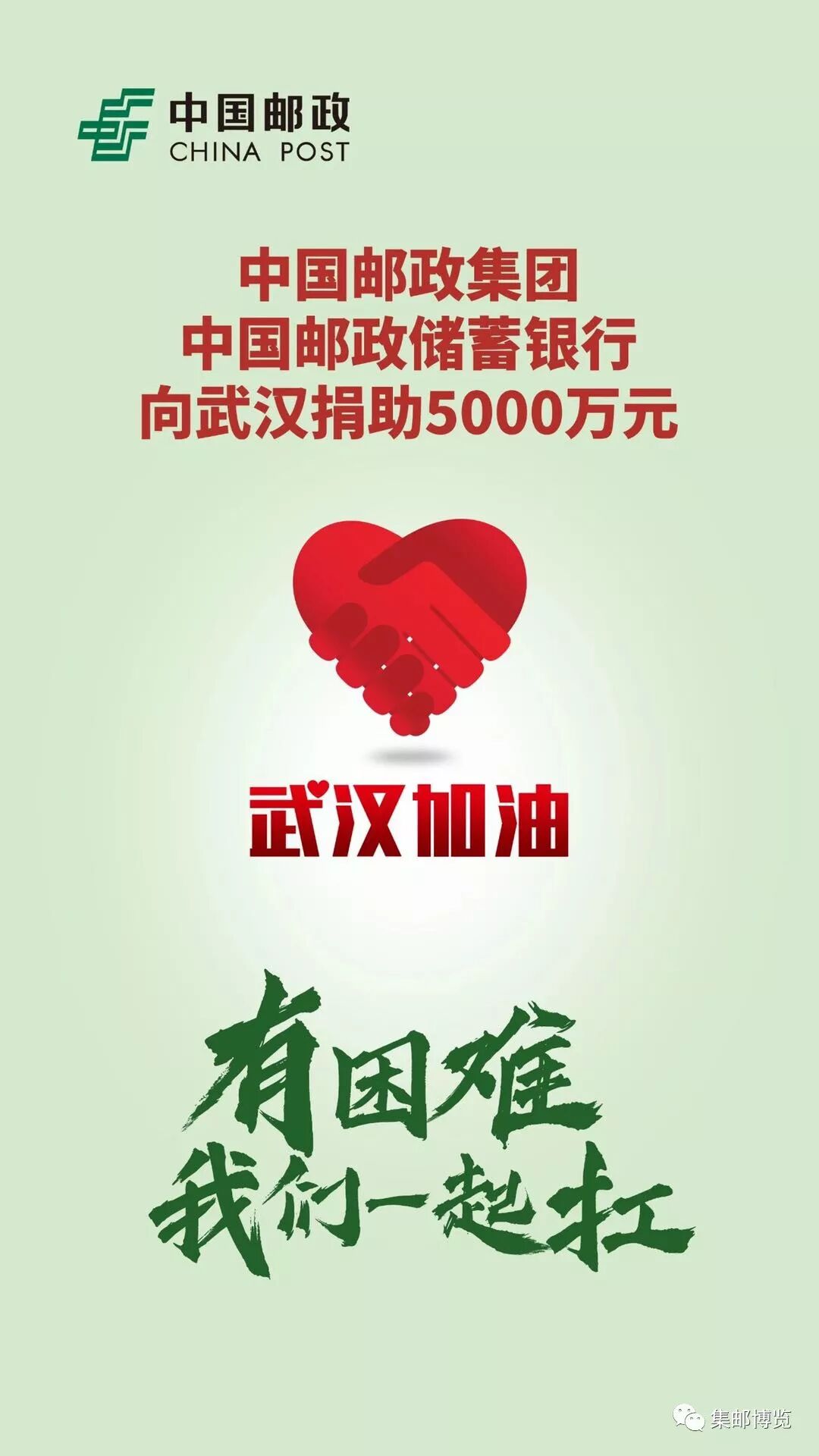 1月25日,中国邮政紧急开通绿色通道,义务为武汉地区提供防疫救援物资寄递服务,对全国寄往武汉市政府指定接收的红十字会机构的捐赠物资,提供全程免费运输和配送服务。1月26日,中国邮政迅速贯彻落实党中央关于新型冠状病毒感染的肺炎疫情防控工作的最新指示精神,再次研究部署做好全系统防控疫情工作,助力打赢疫情防控阻击战。中国邮政集团有限公司、中国邮政储蓄银行决定,向武汉捐助人民币5000万元,用于支援武汉抗击新型冠状病毒感染的肺炎疫情。