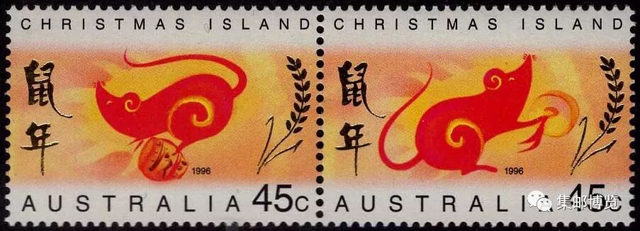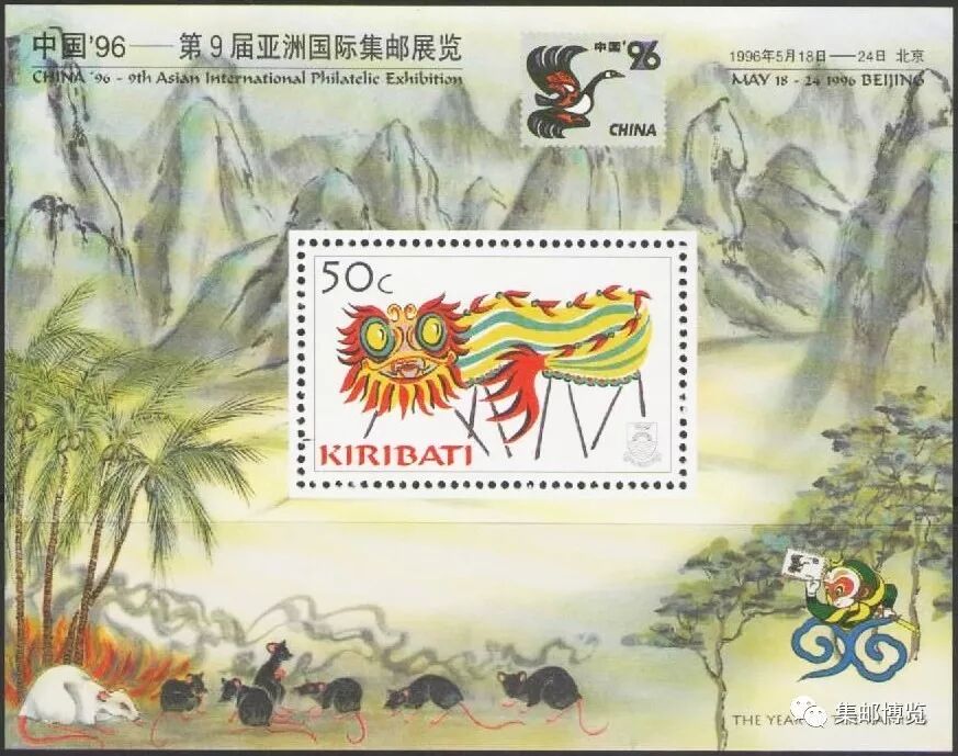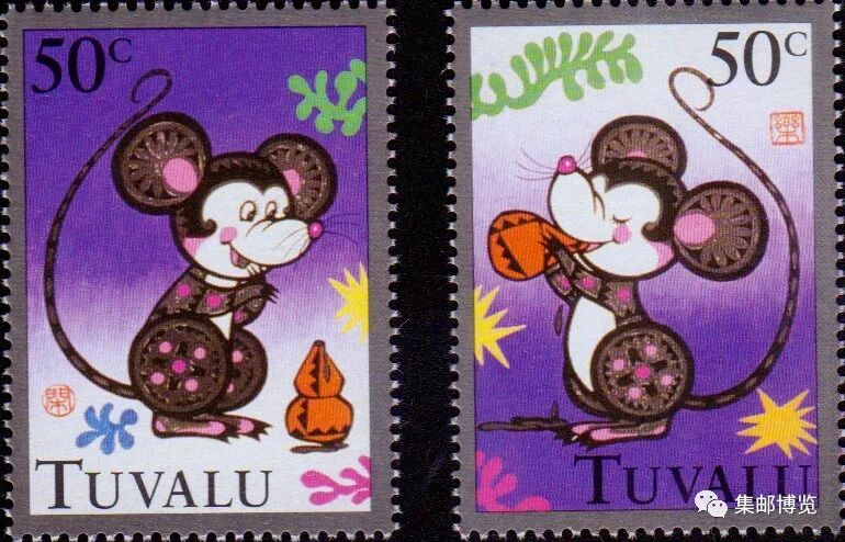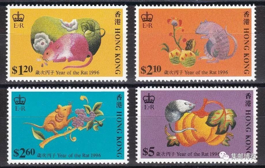 我国香港于1996年发行的鼠年生肖邮票,采用民间刺绣画的表现形式,将鼠和各种多籽植物瓜果相配,寓意多子多孙、福运绵长。
