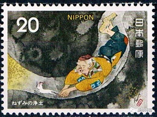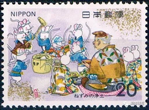 日本曾专门发行过和老鼠有关的民间故事邮票1套3枚,名为《老鼠的净土》,故事很有意思,也跟钱财有点关系,讲的是:从前有一对老爷爷和老奶奶,有一天,老爷爷要上山去砍柴,老奶奶就做了年糕让他带上作午餐。在山上砍了半天柴就到了吃饭时间,正当老爷爷准备吃年糕的时候,一只可爱的小老鼠跑到了他面前,老爷爷就将年糕撕碎给老鼠吃。