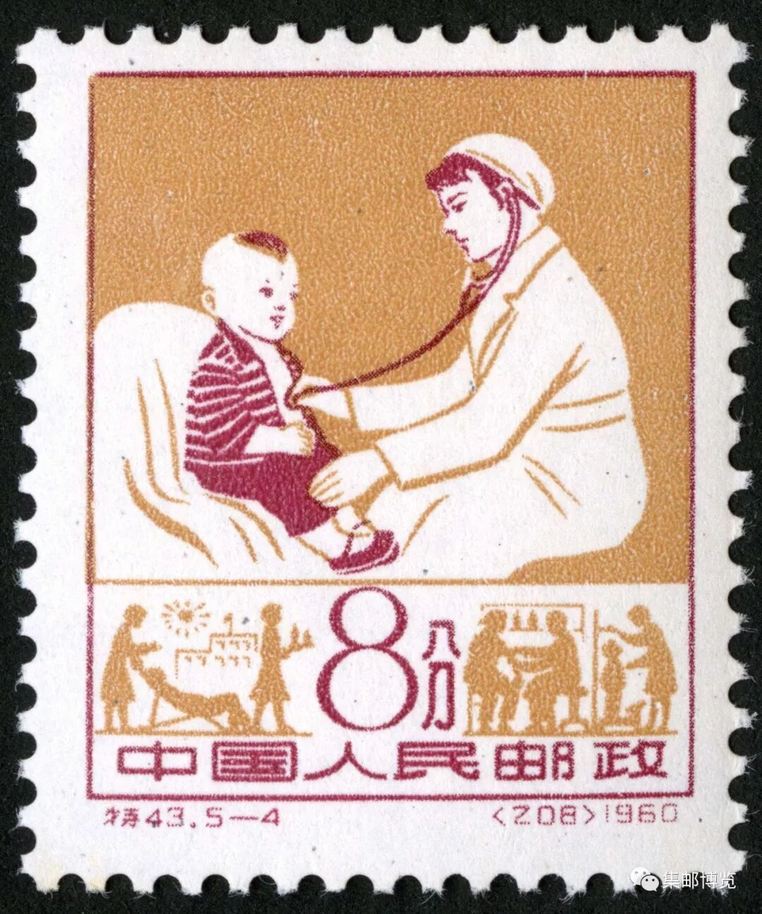 特43《爱国卫生运动》邮票之“预防疾病”中,正在为儿童进行健康体检的医护人员应该佩戴口罩;