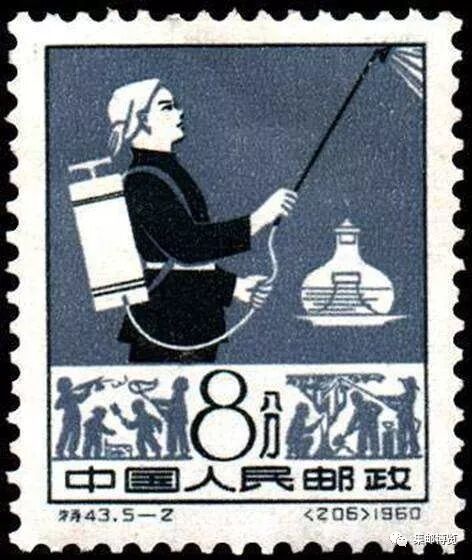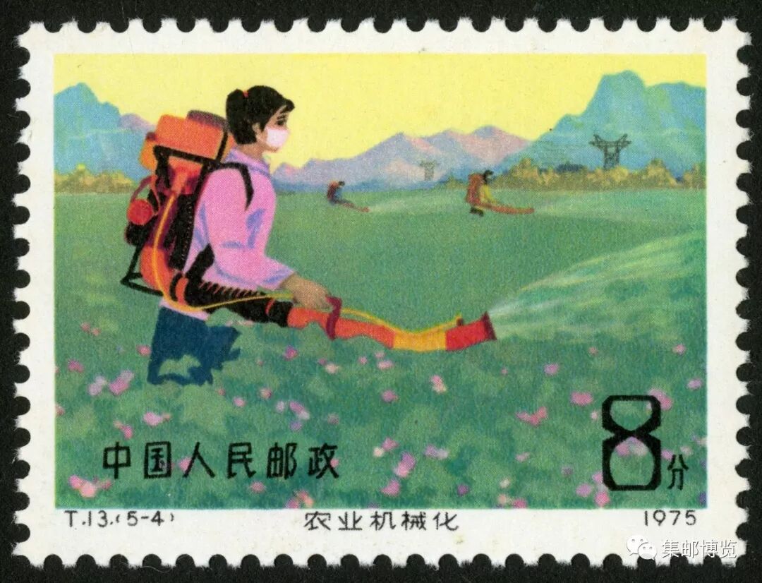 T13《农业机械化》邮票之“棉田防治”中,一名肩背红色喷雾器的女技术员在花期正旺的棉田里喷药治虫,为了防护,她也戴着口罩。