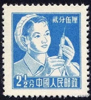 《工农兵图案》普通邮票之“医务工作者”中,正在聚精会神地配制药水、准备为病人打针的女护士应该佩戴自我保护的口罩;