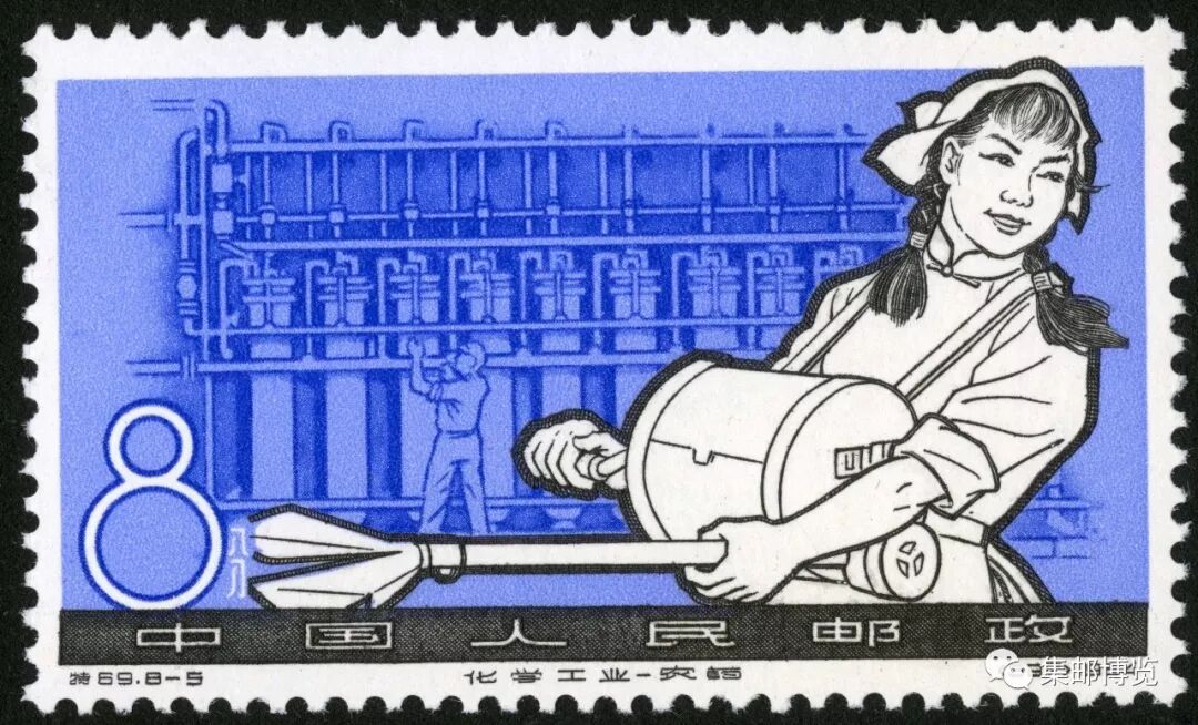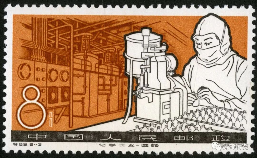 特69《化学工业》邮票之“医药”中,一位制药车间的工人身着防护服、戴着口罩正在进行药品检验与包装。