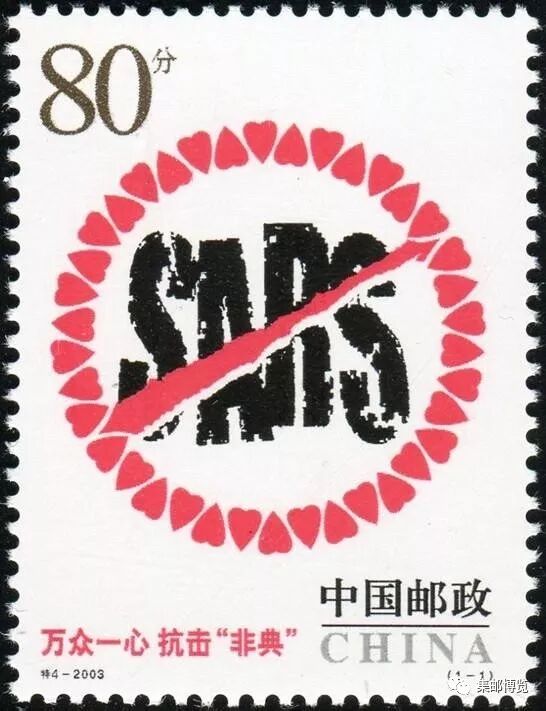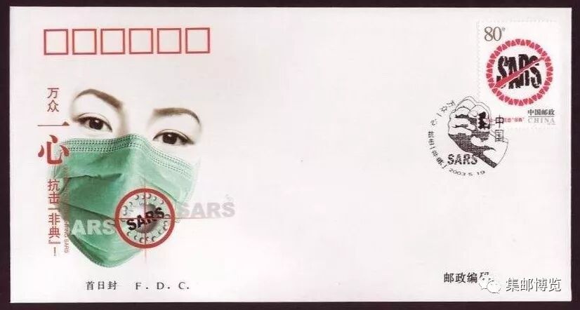 中国集邮总公司2003年5月9日发行的《万众一心抗击非典》邮票首日封上,信封左侧的图案上,一名戴着绿色医用口罩的女医护人员明亮、清纯的眼睛充满希望。