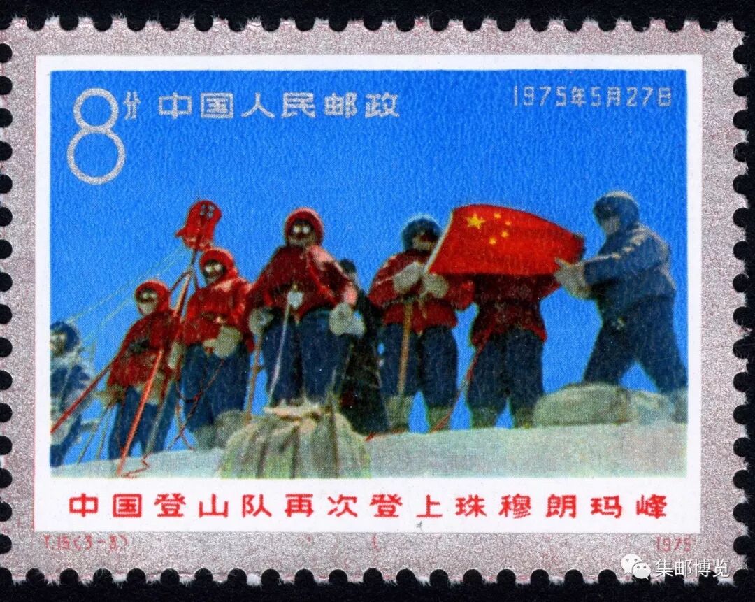 T15《中国登山队再次登上珠穆朗玛峰》邮票之“五星红旗再次飘扬在世界之巅”中,站在世界最高峰展开国旗庆祝登顶胜利的登山队员们在佩戴着防护眼镜的同时都戴着口罩。