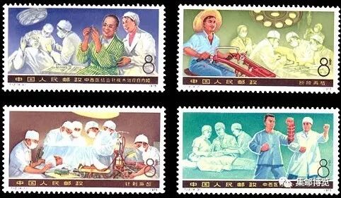 T12《医疗卫生科学新成就》邮票之“针刺麻醉”中,无影灯下,医生们正在对实施针刺麻醉的病人进行手术,手术室中所有的医生和护士都戴着白色的口罩;“断肢再植”中,一位伤愈的男青年双手紧握拖拉机扶手,驾驶着铁牛奔跑在田间地头,而在他自信的目光后面,则再现了医护人员为他实施断肢再植手术的画面,无影灯下的医生护士都佩戴着口罩;“中西医结合针拔术治疗白内障”中,一位成功施行白内障治疗手术的老大娘正在女护士的辅导下练习穿针引线,在她们的身后,两名正在为其他病人做手术的医护人员都戴着口罩。