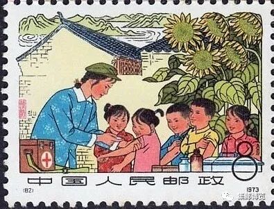 编82《赤脚医生》邮票之“预防”中,盛开的向日葵旁,正在为少年儿童接种疫苗的女赤脚医生工作中应该戴口罩;