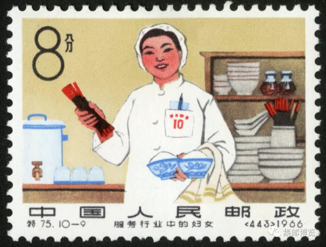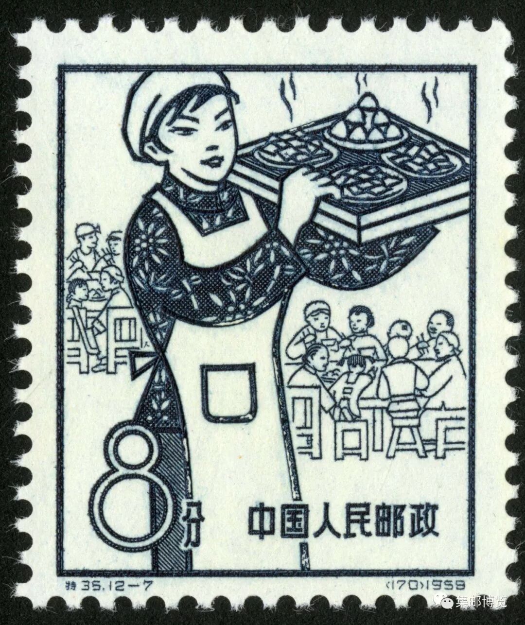 特35《人民公社》邮票之“食堂”中,正在用托盘传送饭菜的女服务员,工作期间应该佩戴口罩。