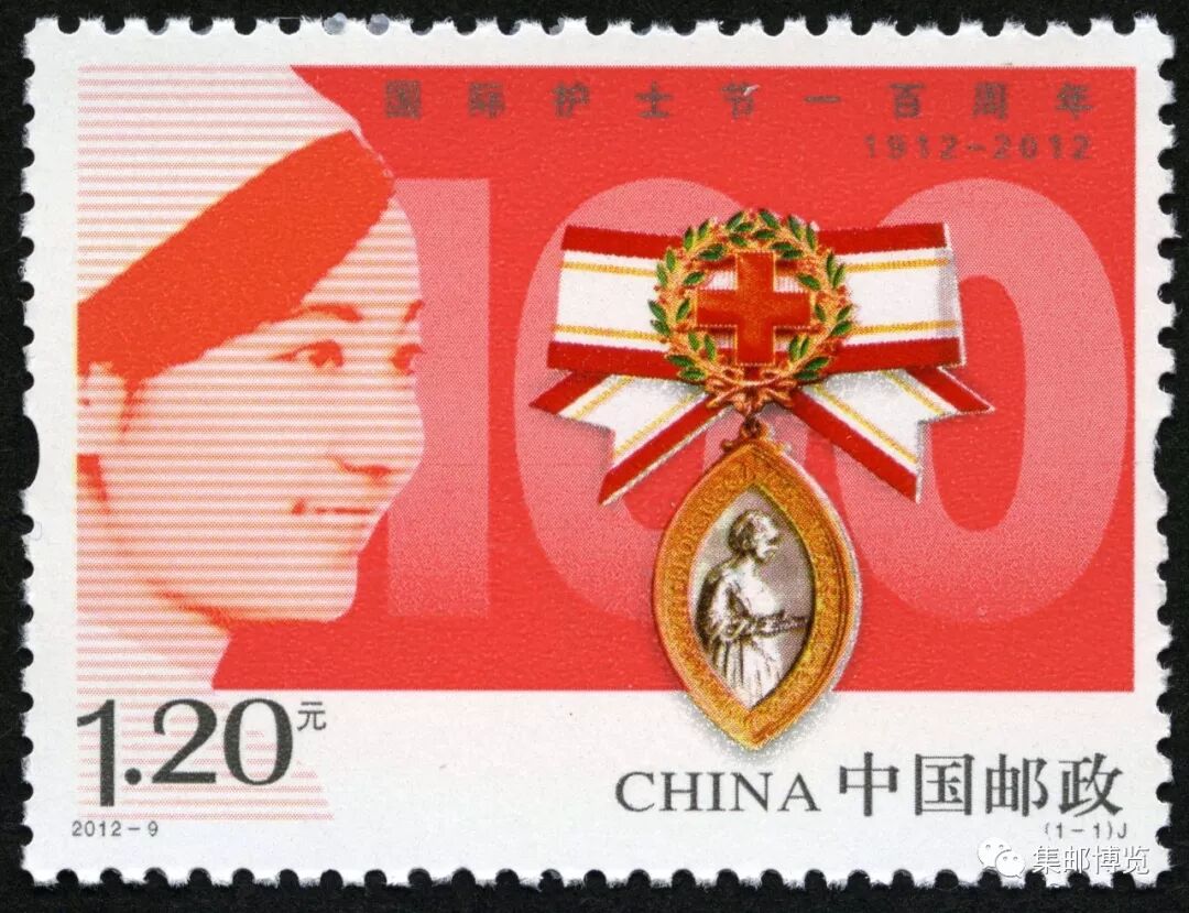 2012-9《国际护士节一百周年》邮票,女护士面对着南丁格尔奖章露出迷人的微笑,画面上如果能够出现一个朦胧的佩戴口罩辛勤工作的护士形象就更好了。