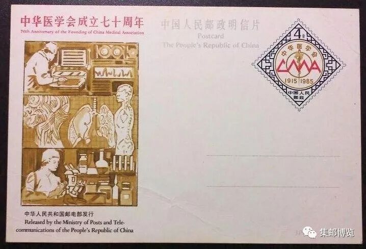 此外, JP4《中华医学会成立七十周年》纪念邮资明信片左侧的图案中,有一名佩戴口罩的男医生正在操作检查仪器的侧面形象;