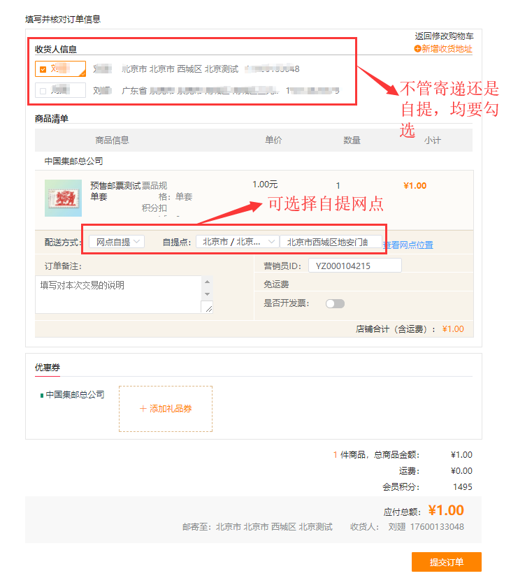 选择地址及配送方式,提交订单。(如果前面选择的是寄递商品,则默认配送方式是寄递;如果选择的是自提商品,则可以选择自提网点。若要更换配送方式,需重新选择商品)