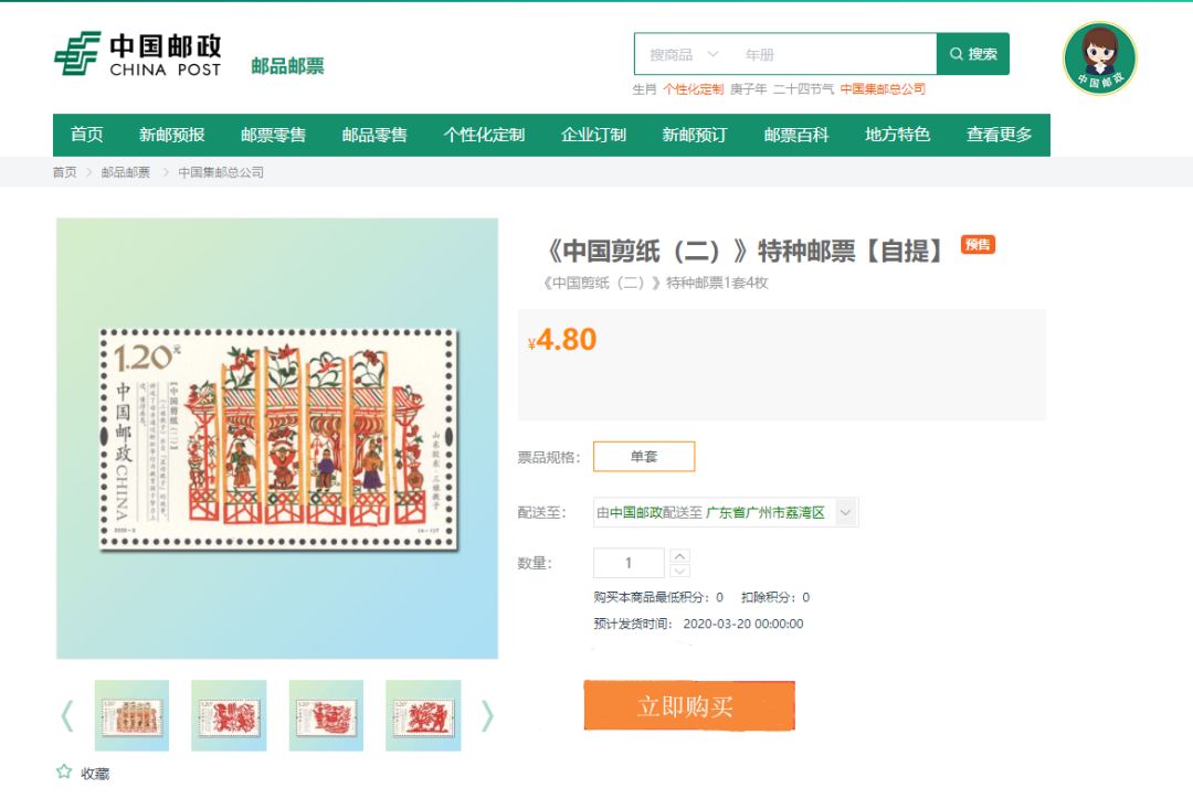 点击“商城”,点击“邮票邮品”分类,进入“集邮频道”首页;在首页的“中国剪纸(二)专区”或者点击搜索框输入”中国剪纸(二)特种邮票”进行搜索,根据实际需要,选择“《中国剪纸(二)》特种邮票【寄递】”或者“《中国剪纸(二)》特种邮票【自提】”。