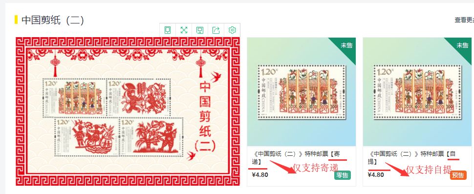 返回集邮频道首页,根据实际需要,在“中国剪纸(二)”专区选择“《中国剪纸(二)》特种邮票【寄递】”或者《中国剪纸(二)》特种邮票【自提】。