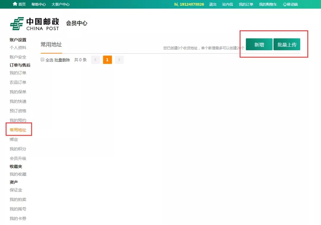 继续在“会员中心”页面,点击“常用地址”,点击“新增”(逐个地址维护)或“批量上传”,根据提示输入地址信息。(自提也需要输入地址才可以完成订单)
