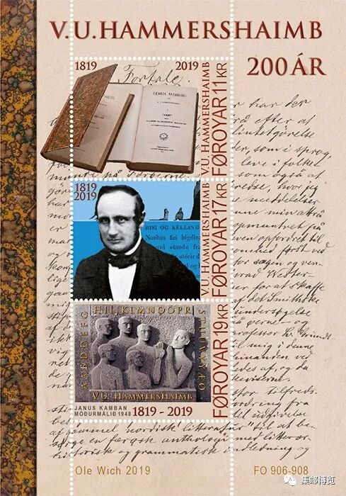 FO 898-899 《1919年临时邮票发行100周年》小全张FO 905 《2019年SEPAC》邮票:古旧住宅FO 906-908 《哈默沙因布诞辰200周年》小全张FO 916 《爱琳勃格·吕岑诞辰100周年纪念》邮票FO 917 《“乔安娜”号和“韦斯特华尔德”号渔船》邮票FO 918 《法罗群岛教堂的纺织品》邮票:红色十字褡FO 919 《法罗群岛教堂的纺织品》邮票:绿色十字褡法罗群岛是丹麦王国的海外自治领地,设独立的议会作为自治政府机构,外交和军事由丹麦负责,面积1399平方公里,人口不足5万,其地处欧洲,位于挪威西部约602公里、苏格兰西北约310公里处,由18个岩石岛屿组成,岛上居民多为斯堪的纳维亚人的后代。法罗群岛的官方语言为法罗语和丹麦语,首都托尔斯港,货币通用丹麦克朗,并拥有自己的货币法罗克朗(与丹麦克朗等值)。法罗群岛被称为“羊之岛屿”,其中一个原因是法罗群岛的名称法罗语“Føroyar”的原意便是“羊之岛”。1975年以前,法罗群岛使用丹麦邮票,邮政业务由丹麦负责。法罗群岛的首套邮票发行于1975年1月30日,丹麦印制。1976年4月1日开始,法罗群岛正式从丹麦手中接管邮政大权,邮政独立并开始发行邮票。