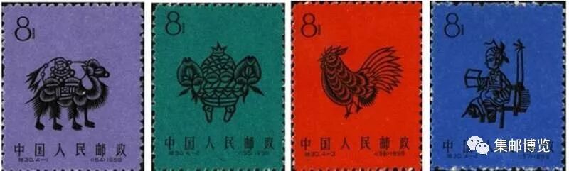 新中国最早的剪纸题材邮票,当推1959年发行的特30《剪纸》邮票。在小小票幅之内,展现出骆驼、石榴、公鸡、戏剧人物的剪纸作品;