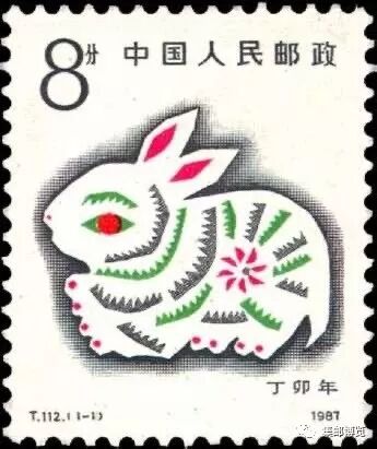 在首轮生肖系列邮票中,1987年发行的《丁卯年》兔票采用的是剪纸图案;