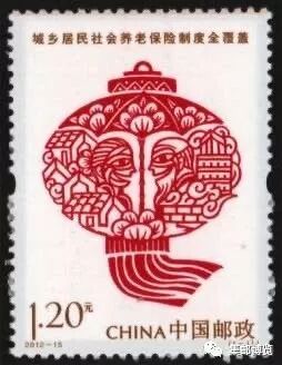 2012年7月1日发行的《城乡居民社会养老保险制度全覆盖》纪念邮票一套1枚,图案为一盏宫灯造型的剪纸。宫灯中一对开怀而笑的老年夫妇以及作为背景的新房和农村风貌,反映了城乡居民社会养老保险制度全覆盖后,老年人生活无忧的社会图景。在我国发行的生肖邮票中,传统的民间剪纸艺术曾多次展现于方寸之中,烘托了浓郁的新年吉祥喜庆气氛。