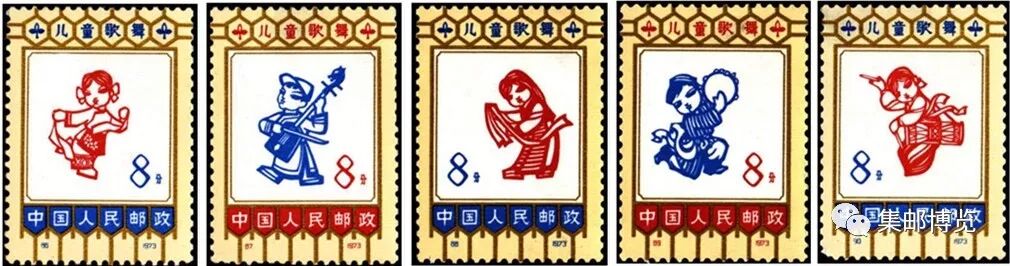 1973年6月1日,邮电部又推出编号86—90《儿童歌舞》剪纸邮票5枚,邮票图案线条流畅,造型优美,画面表现了汉、蒙、藏、维吾尔、朝鲜族少年儿童歌舞的场景;2000年2月5日发行的《春节》特种邮票小型张,在边纸上绘有各种剪纸图案, 以此表达了吉祥如意、年年有余、富贵平安“喜迎春”的主题;2010年8月16日发行的《民间传说——牛郎织女》特种邮票,是一套采用民间剪纸艺术表现民间故事的邮票;
