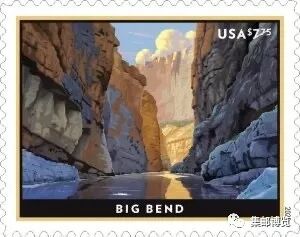 2020年1月18日,美国邮政发行一枚优先邮件邮资邮票,主题为大转弯国家公园。大转弯国家公园(Big Bend National Park)建立于1944年6月12日,是德克萨斯州的两个国家公园之一,它地处偏远的德州西南部,紧邻墨西哥边境,这里与墨西哥仅隔着一条格兰德河,河中央就是国界。而“大转弯”这个名字的由来也正是因为这条河——它流经公园,并在此转了90度弯,因而此地叫作“大转弯”。