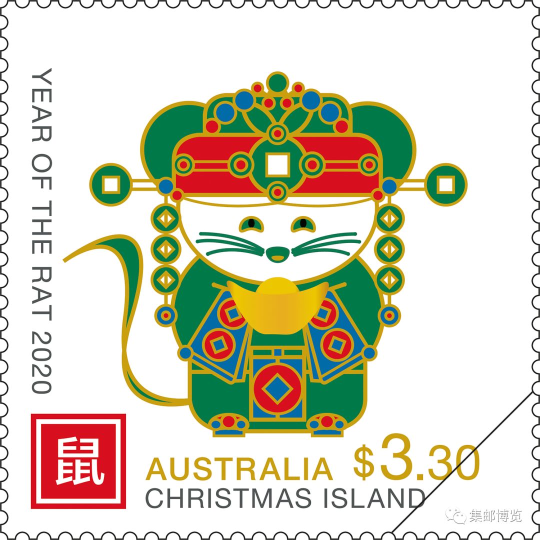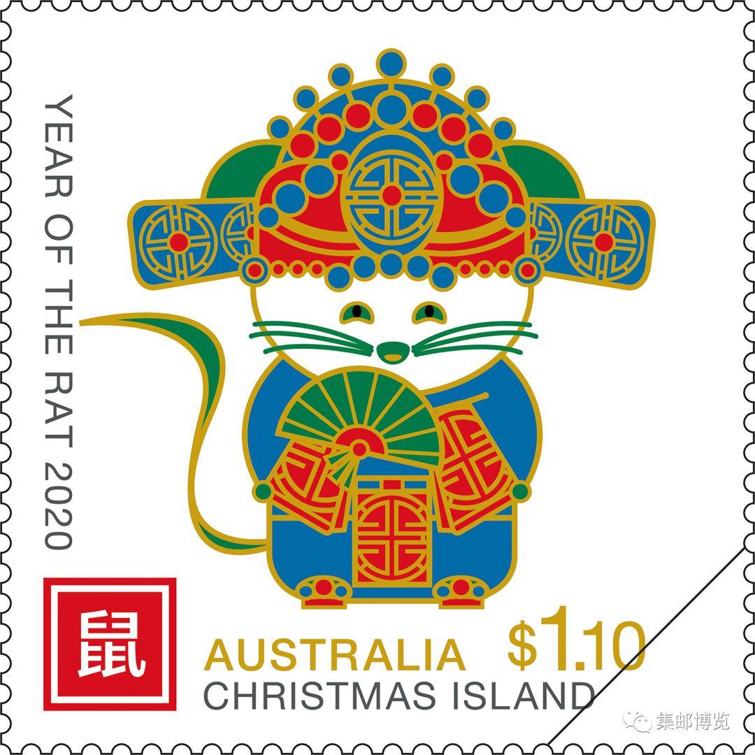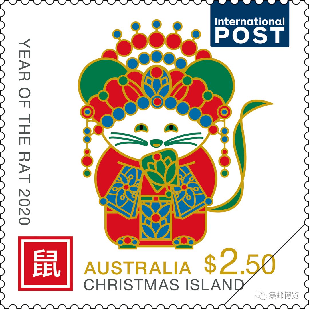 2020年1月8日,澳大利亚邮政为圣诞岛发行一套三枚农历生肖鼠年邮票。这套邮票由Yan Lin设计,创造性地将生肖与中国传统的京剧相结合,以三枚邮票分别表现京剧的生、丑和旦三个行当。此外还发行一种金版小版张,六枚邮票组成“888”图案,而且只发行了888枚。