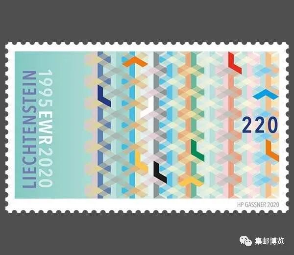 在这枚《加入欧洲经济区25周年》纪念邮票上,一个颜色柔和、以“网络”为设计理念的图形,象征列支敦士登公国加入欧洲经济区(EEA)25周年。邮票的设计师汉斯·彼得·加斯纳(Hans Peter Gassner)使用了部分紫外光固化涂料来突出设计的九种颜色――这些颜色在所有欧洲经济区成员国的国旗上都可以找到。