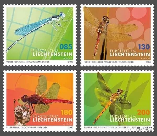和第一组一样,第二组也是最后一组绚丽多彩的蜻蜓普通邮票,依然由自然摄影师克萨韦尔•罗泽(Xaver Roser)拍摄。他在列支敦士登的鲁格勒里特(Ruggeller Riet)自然保护区用相机捕捉到了这组蜻蜓的美丽身影,它们分别是:白腿豆娘、红脉蜻蜓、红蜻蜓、斑点赤蜻。