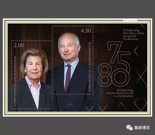 列支敦士登王室今年将庆祝两个特别的纪念日:2020年2月14日,列支敦士登汉斯-亚当二世公爵庆祝75岁生日;4月14日,列支敦士登公爵夫人玛丽庆祝80岁生日。列支邮政为公爵(大公)夫妇的生日发行一款小全张以示庆贺,此款小全张中含有两枚交错开孔的邮票,并采用精美的烫金压凸工艺印制。