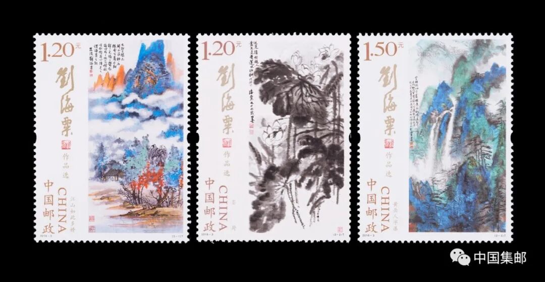 2016-3 《刘海粟作品选》一套3枚,本套邮票分别为:《江山如此多娇》《墨荷》《黄岳人字瀑》。