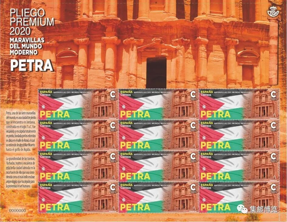 2020年1月14日,西班牙邮政发行一枚《世界奇迹》系列邮票,主题为佩特拉古城。佩特拉古城是约旦南部的一座神秘的历史古城,也是约旦最负盛名的古迹之一。2007年7月8日被评选为世界新七大奇迹,联合国教科文组织将其列为世界文化遗产之一。