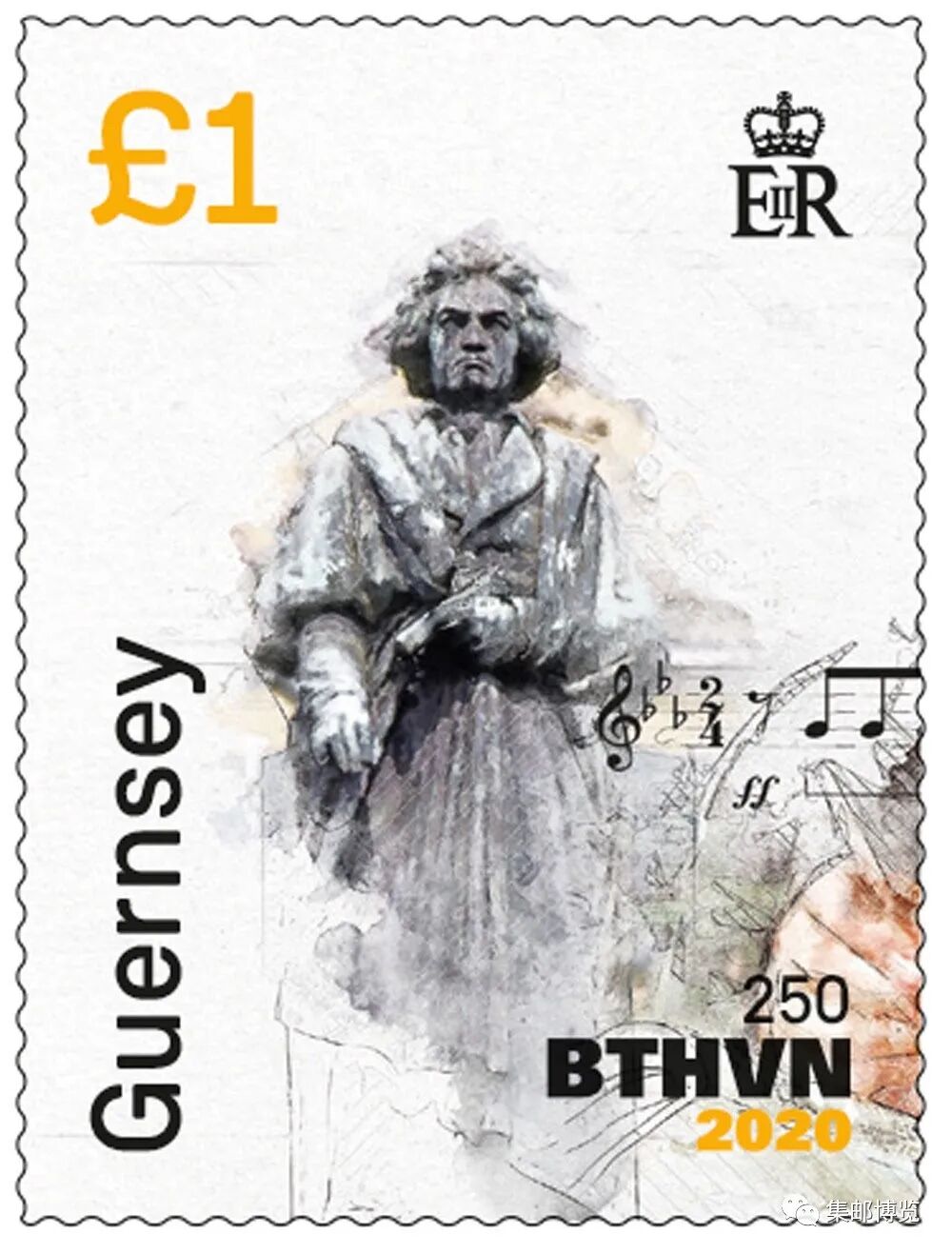 2020年1月21日,根西岛邮政发行一枚纪念贝多芬诞辰250周年的邮票,邮票图案为贝多芬的出生地波恩的大教堂广场上的贝多芬雕像。1770年,贝多芬出生在波恩市中心的一幢房子里,并且在那里生活了22年。现在贝多芬的故居已经变为博物馆,在那里收藏着贝多芬使用过的乐器、手稿和文献等等。这座贝多芬纪念雕像的草图由当时的雕刻家、德累斯顿艺术学院的Ernst Haehnel教授绘制,雕刻工作则是由雕刻家、青铜铸造师Erzgiesser完成的。1845年8月12日,人们为纪念碑举办了极其尊贵的落成典礼。普鲁士国王弗里德里希四世、英国维多利亚女王、萨克森科堡公国的阿尔伯特王子等人物都出席了典礼。
