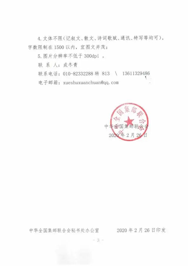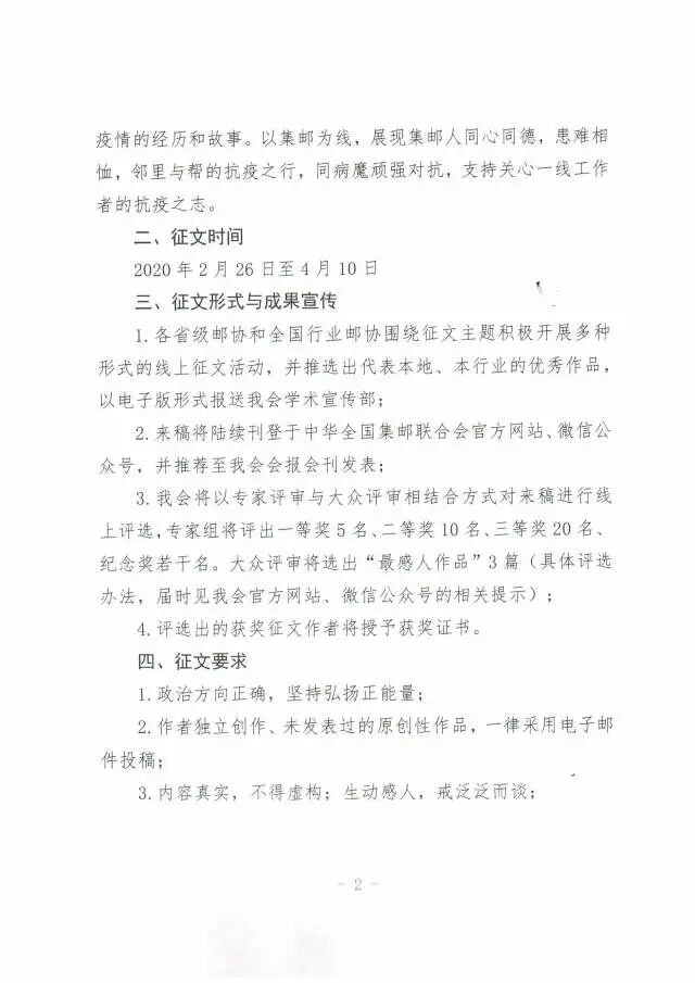 讲述疫情期间,发生在身边的抗疫英雄、一线工作人员的故事;讲述自己投身抗疫斗争的故事以及集邮者用特殊的方式抗击疫情的经历和故事。以集邮为线,展现集邮人同心同德,患难相恤,邻里与帮的抗疫之行,同病魔顽强对抗,支持关心一线工作者的抗疫之志。1.各省级邮协和全国行业邮协围绕征文主题积极开展多种形式的线上征文活动,并推选出代表本地、本行业的优秀作品,以电子版形式报送我会学术宣传部;2.来稿将陆续刊登于中华全国集邮联合会官方网站、微信公众号,并推荐至我会会报会刊发表;3.我会将以专家评审与大众评审相结合方式对来稿进行线上评选,专家组将评出一等奖5名、二等奖10名、三等奖20名、纪念奖若干名。大众评审将选出“最感人作品”3篇(具体评选办法,届时见我会官方网站、微信公众号的相关提示);2.作者独立创作、未发表过的原创性作品,一律采用电子邮件投稿;4.文体不限(记叙文、散文、诗词歌赋、通讯、特写等均可),字数限制在1500以内,宜图文并茂;电子邮箱:xueshuxuanchuan@qq.com