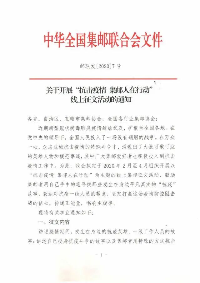 近期新型冠状病毒肺炎疫情肆虐武汉,扩散至全国各地。在党中央的领导下,全国人民投入了一场没有硝烟的战争。在万众一心、众志成城抗击疫情的特殊斗争中,涌现出了大批可歌可泣的英雄人物和模范事迹,其中广大集邮爱好者也积极投入到抗击疫情工作中。为此,中华全国集邮联合会拟定于2020年2月至4月组织开展以 “抗击疫情 集邮人在行动”为主题的线上集邮征文活动,鼓励集邮者用自己手中的笔寻找那些发生在身边平凡真实的抗疫故事,表达对抗疫一线人员的敬意,坚定打赢这场疫情防控阻击战的信心,传递正能量,唱响主旋律。