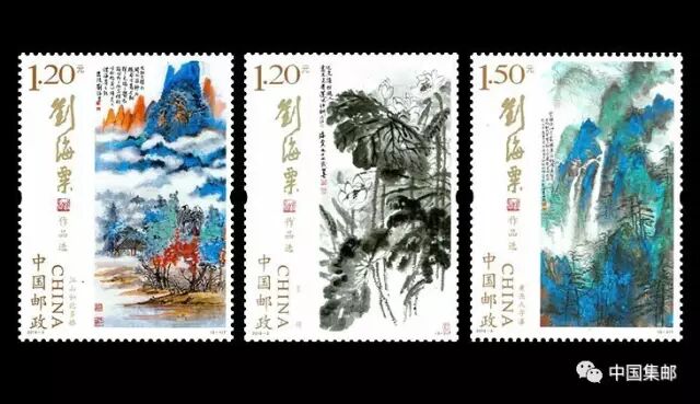 刘海粟生于1896年3月16日,为了纪念他,中国邮政于2016年3月16日刘海粟先生120周年诞辰日当天发行了《刘海粟作品选》特种邮票,全套邮票3枚,邮票名称分别为:江山如此多娇、墨荷、黄岳人字瀑。