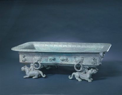 都说我以瑰丽雄奇的纹饰与造型见称,仔细研究过我工细瑰丽的盘体龟鱼纹与蓄势待发的四立体兽形足便可得知,称赞我为战国青铜盘中罕见的佳作绝非虚名。2003年,我也荣登“国家名片”,与曾侯乙匜、莲鹤方壶一起被定格在方寸之间。