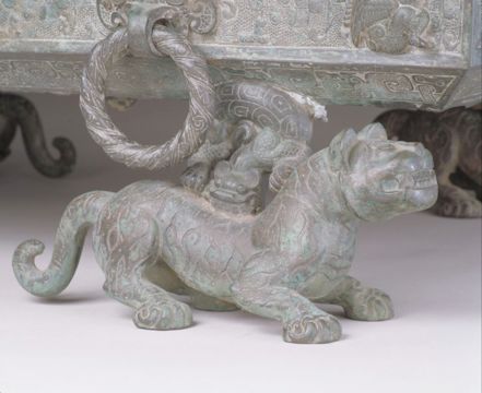 在我正面腹身两侧各装饰一兽面衔环铺首,铺首之间是两头栩栩如生的熊,铺首的外侧各有一人面鸟嘴带翼神兽。我的左右两侧各有一蹲坐的神兽,名为獬豸是公正的象征,獬豸的上面各有一只羊。我的盘底四侧装饰蟠螭纹,四角各有一条蟠螭向下伸出,螭口衔咬下面老虎的背脊,两爪抓住虎背;方盘的足部为虎的造型,威风凛凛。我的盘内底部装饰着七行龟、鱼和青蛙,铸造精湛!
