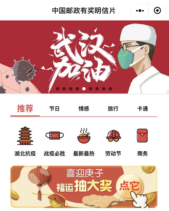 数字明信片是基于互联网技术对传统纸质明信片的升级服务,通过微信小程序即可实现在线发送电子明信片、定制明信片打印实寄等功能。随着疫情防控工作进入决战决胜的关键阶段,中国邮政数字明信片平台在原有”战疫必胜“专区的基础上,全新开辟“湖北抗疫”专区,首批推出由著名画家、邮票设计家雷汉林创作的以“全力抗疫,战‘疫’必胜”为主题的19枚明信片。