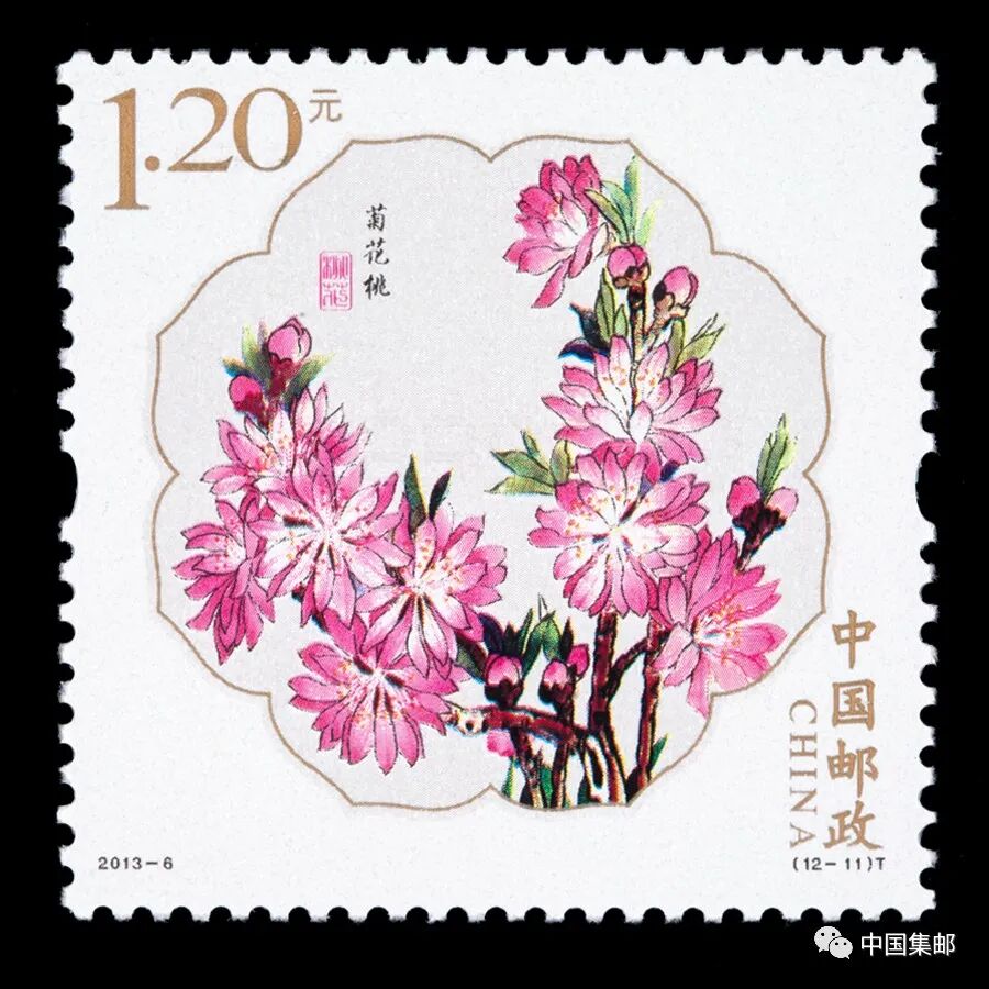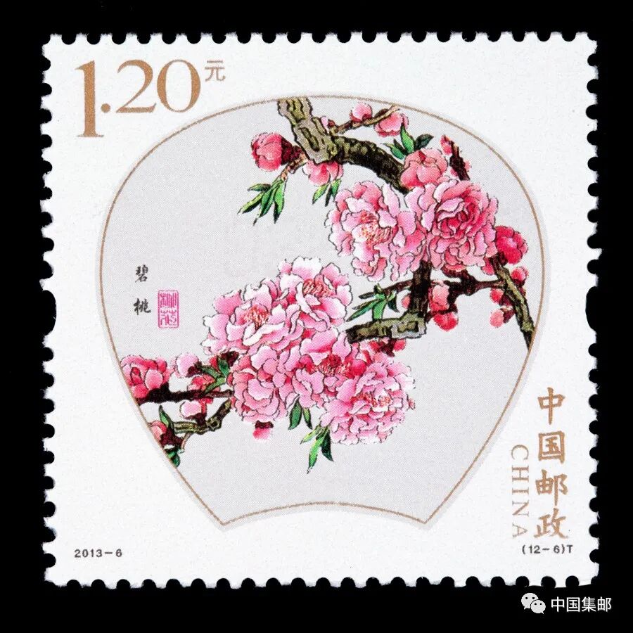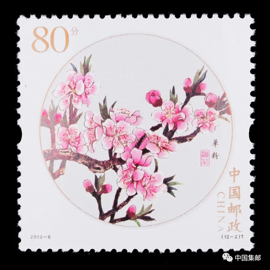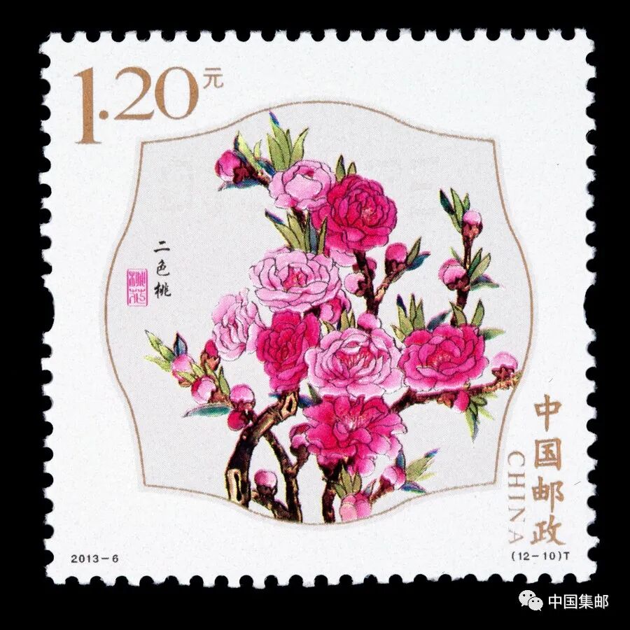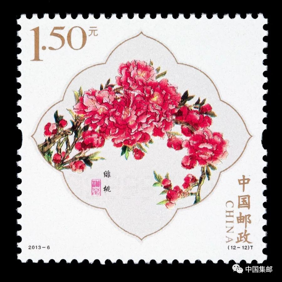 中国邮政曾于2013年3月16日发行2013-6《桃花》特种邮票,全套邮票十二枚,展现白碧桃、单粉、品霞、紫叶桃、瑕玉寿星、碧桃 、五宝桃、照手红、绿萼垂枝、二色桃、菊花桃、绯桃十二个品种的桃花。