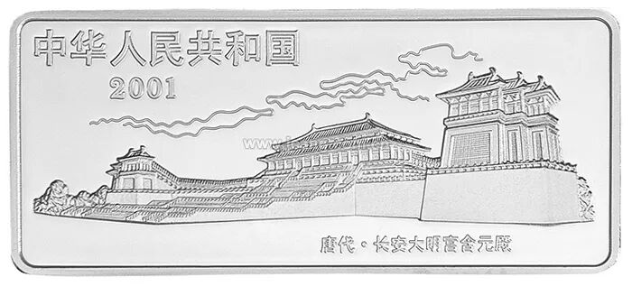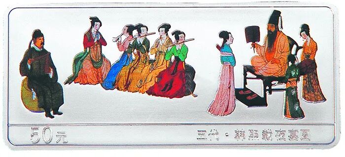 2001年中国人民银行发行了“中国古代名画系列(韩熙载夜宴图)5盎司长方形彩色银质纪念币”。纪念币正面主景为长安大明宫含元殿,背面为《韩熙载夜宴图》局部图案。