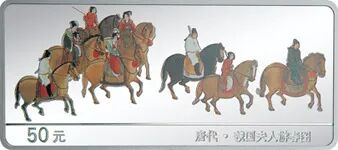 1999年中国人民银行发行了“中国古代名画系列(虢国夫人春游图)5盎司长方形彩色银质纪念币”。纪念币正面主景为长安大明宫含元殿,背面图案为《虢国夫人游春图》。