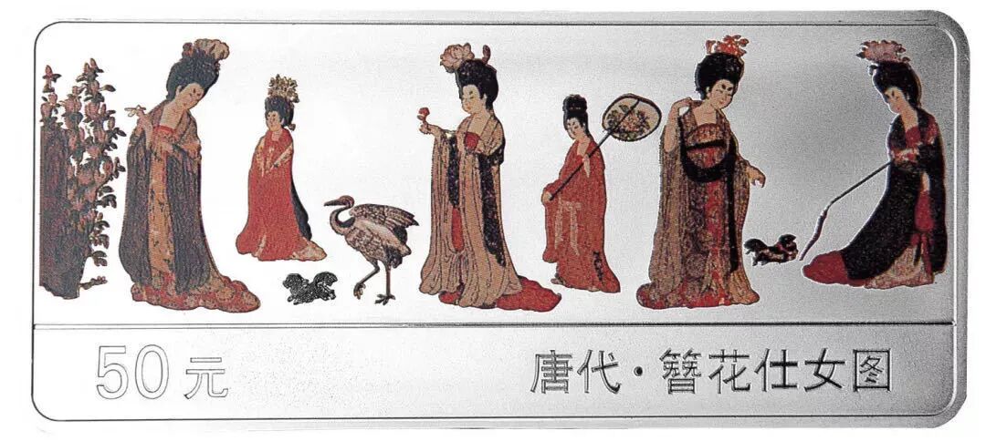 1998年,中国人民银行发行了“中国古代名画系列(簪花仕女图)5盎司长方形彩色银质纪念币”,纪念币正面主景为长安大明宫含元殿,背面图案为《簪花仕女图》。